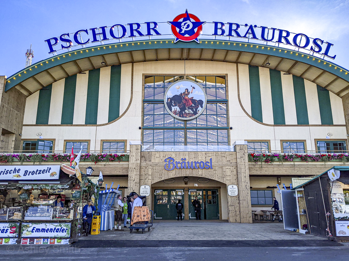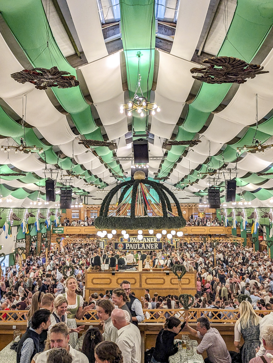 After Oktoberfest was canceled in 2020 and 2021, the Pschorr-Bräurosl tent reopened with new owners and a brand-new look. And it is stunning! This is the tallest of all the Oktoberfest beer tents and one of the most beautiful, in my opinion. And with seating for more than 10,000 people, it’s also the largest.