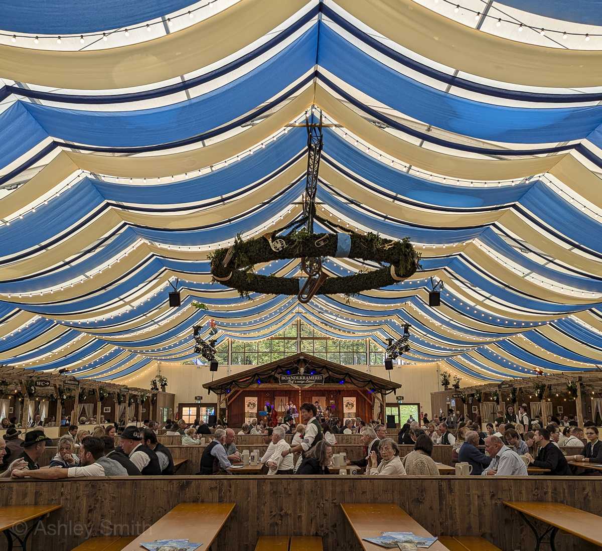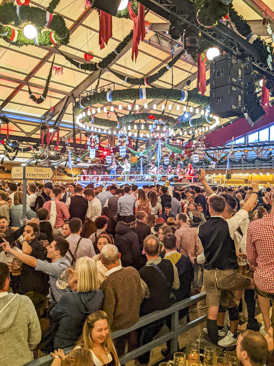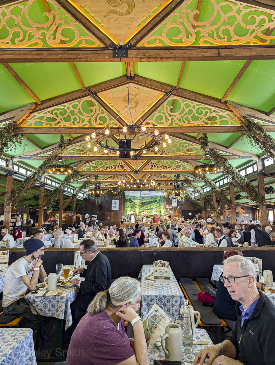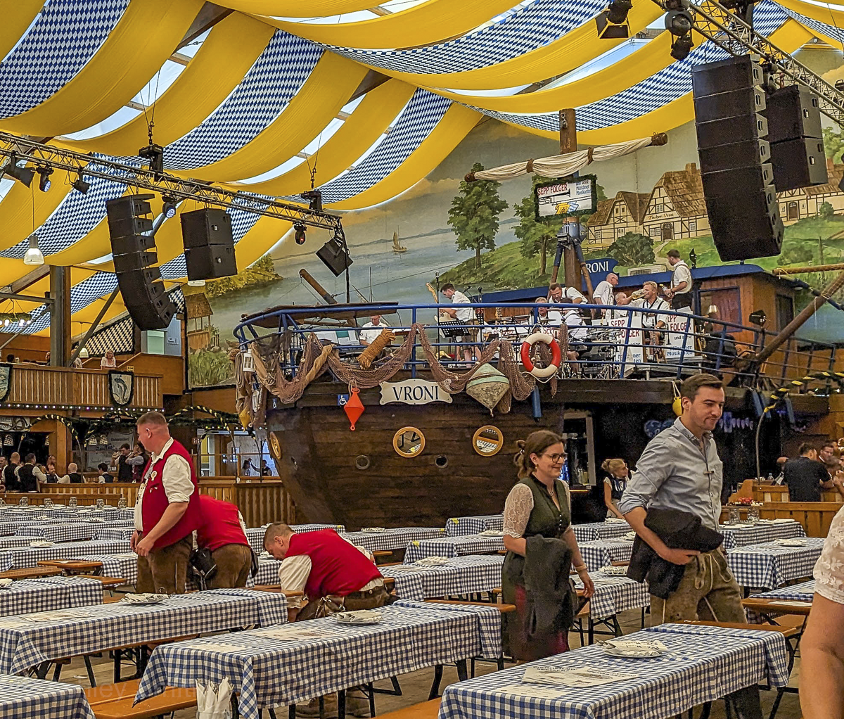 Opened in 2024, this is the newest Oktoberfest beer tent. This tent is known as the “Musician’s tent” and their focus is on creating a jovial atmosphere of music and dancing. It has a large dance floor and a rotating list of musical performers and bands (unlike the others who use the same bands throughout the festival).