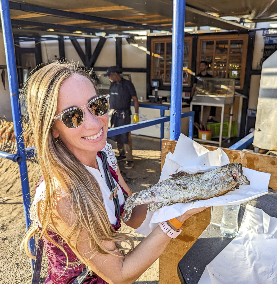 The Fischer-Vroni tent is the one where you’ll find them roasting fish on sticks outside (steckerlfisch). And for this reason, the entire tent smells like smoked fish and it’s not good. This is the main, and maybe only, reason I spend as little time as possible here. I just can’t. It’s so bad. That said, the fish is actually delicious and I highly recommend it! Just eat it outside.