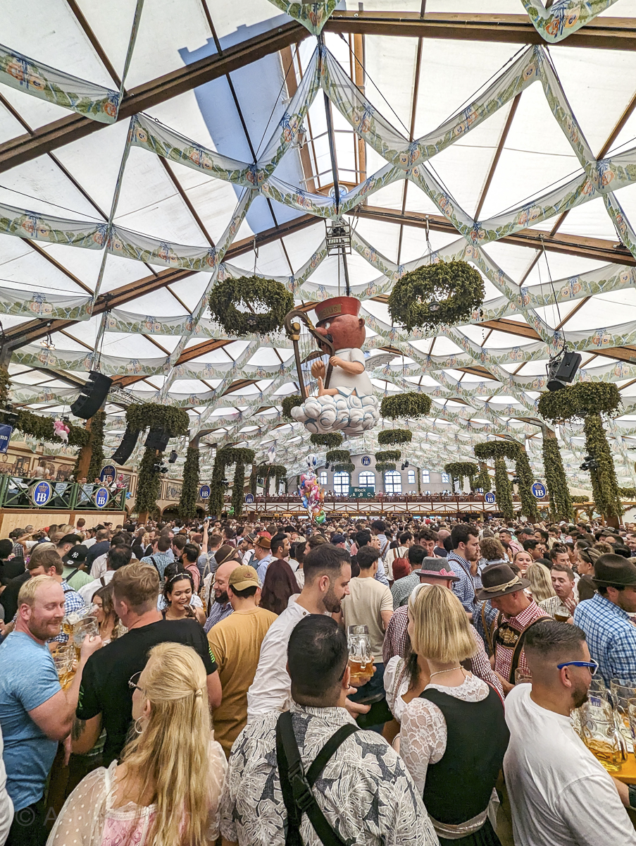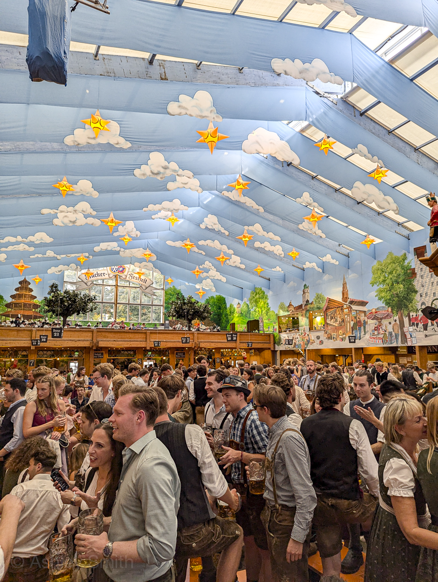 The Hacker tent is arguably the most recognizable with its “Bavarian Heaven” motif and pretty blue sky. It’s definitely one of my favorites.