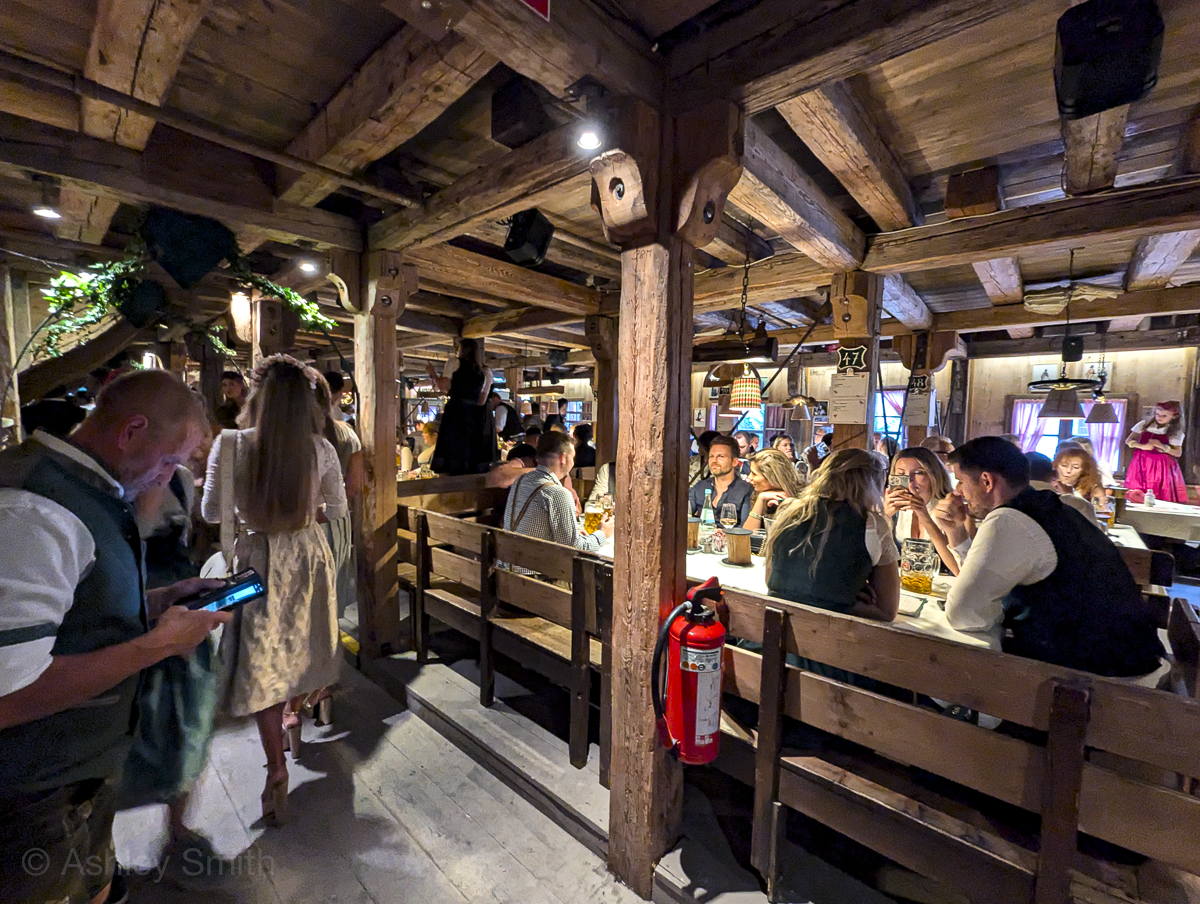 This is the biggest of the Oide Wiesn tents and another personal favorite. It’s beautifully decorated and has tons of traditional performances all day and night. This is the place to go if you want to see “Oktoberfest” stuff like the Schuhplattler (slap dance), Goaßlschnalzen (whip cracking), and more. This tent also has an elevated dance floor that anyone can dance on! (I’ve humiliated myself up here several times.)
