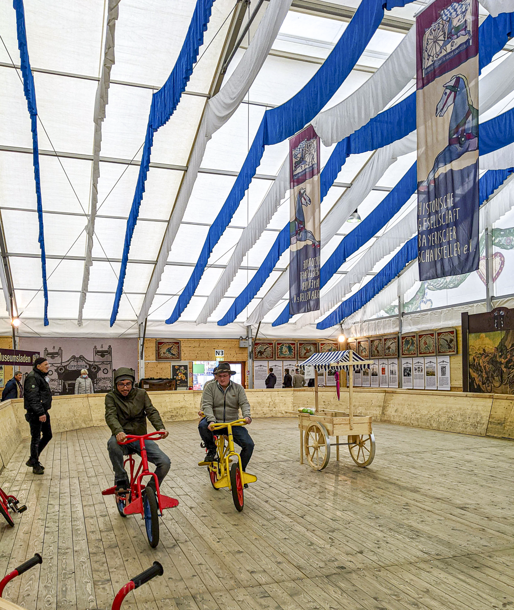 Oktoberfest’s Museum Tent is definitely the weirdest one here. Playing on the 1800s theme of the Oide Wiesn, it’s also home to several museum-style exhibits from Oktoberfests of yore. You’ll find a collection of wooden keg-tapping mallets used to open the festival over the years, a carousel, a candy shop, people riding wacky old-timey bikes, and an overall creepy-circus theme.