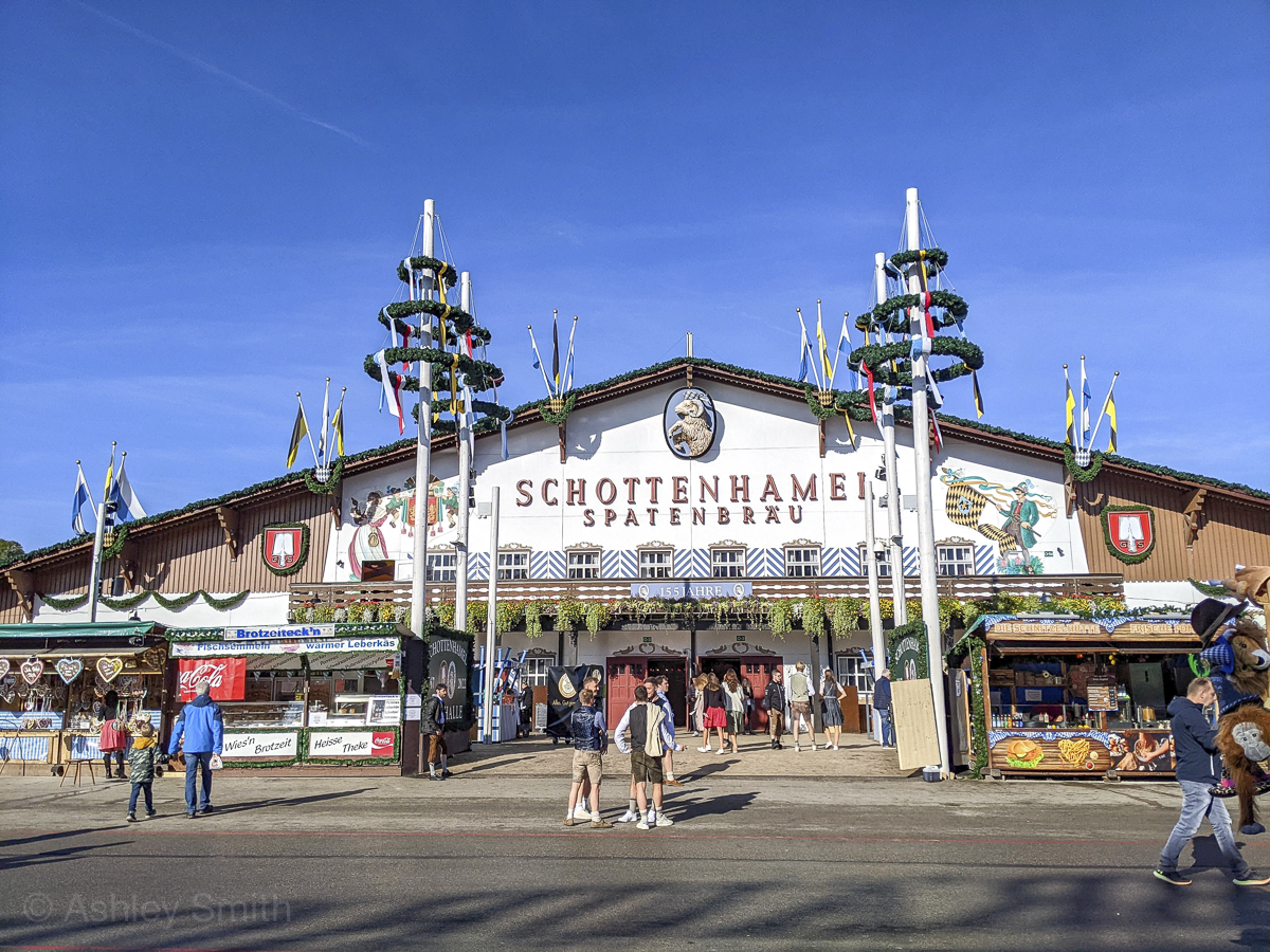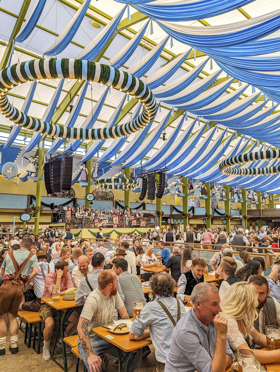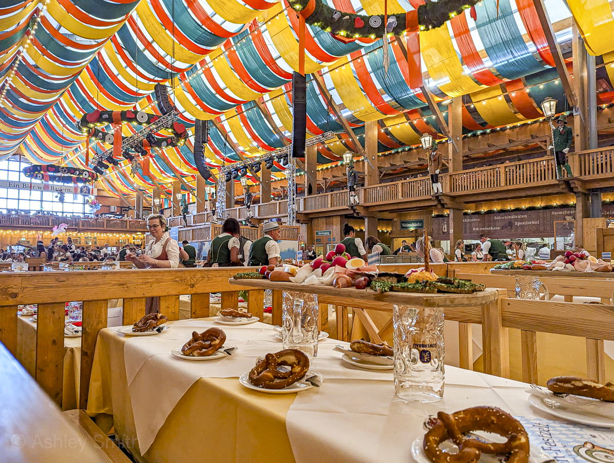 Getting into the Oktoberfest beer tents is completely free. There’s no charge to get in, no charge to sit at a table, no minimum purchase, nothing. Totally free. Don’t let anyone tell you otherwise or try to sell you “Oktoberfest tickets” or anything like that.