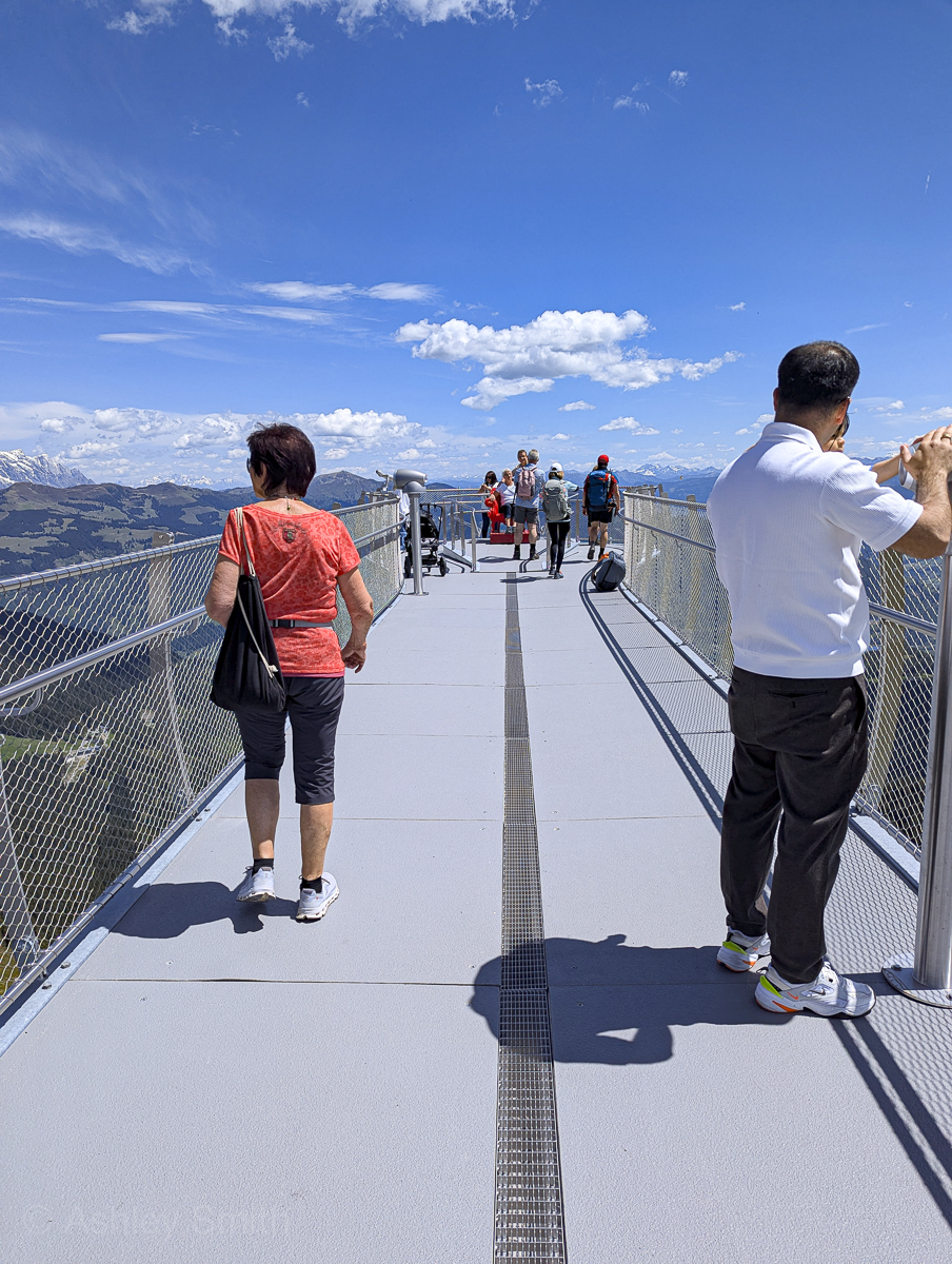 There are several lookout points along this trail where you can get some stunning mountain views. The biggest and most popular is the “Kaiserblick” Panorama Platform just a few steps from the Schmittenhöhebahn station at the top. This platform is brand new (summer 2024), has a glass floor, and juts out over the mountainside. From here, you can see 30 different 10,000-foot peaks.