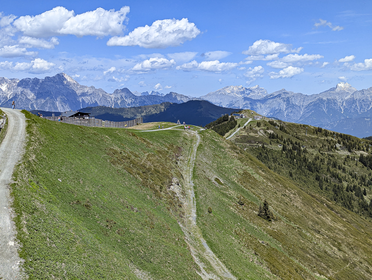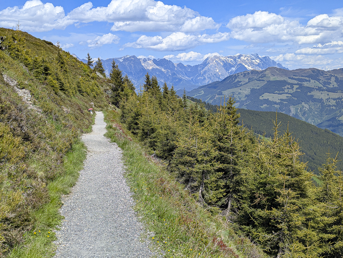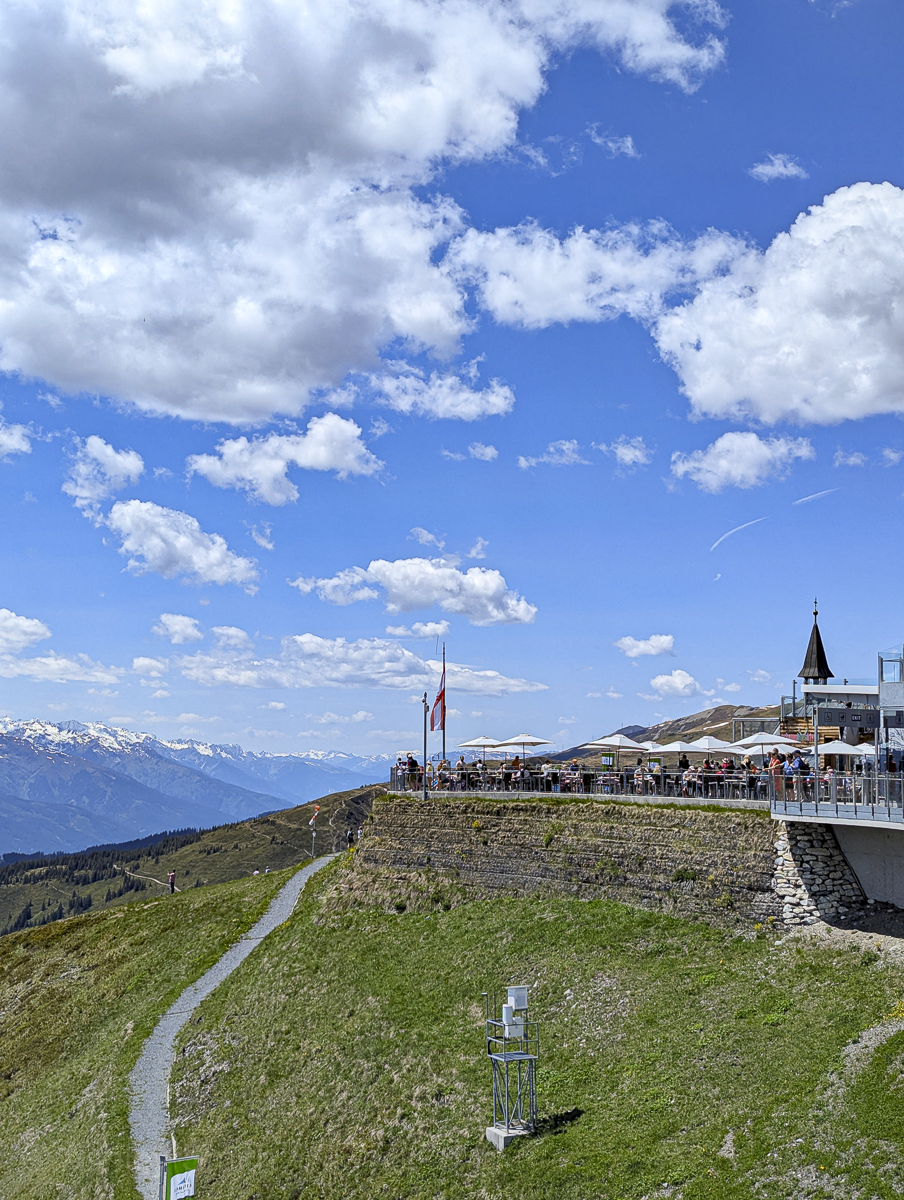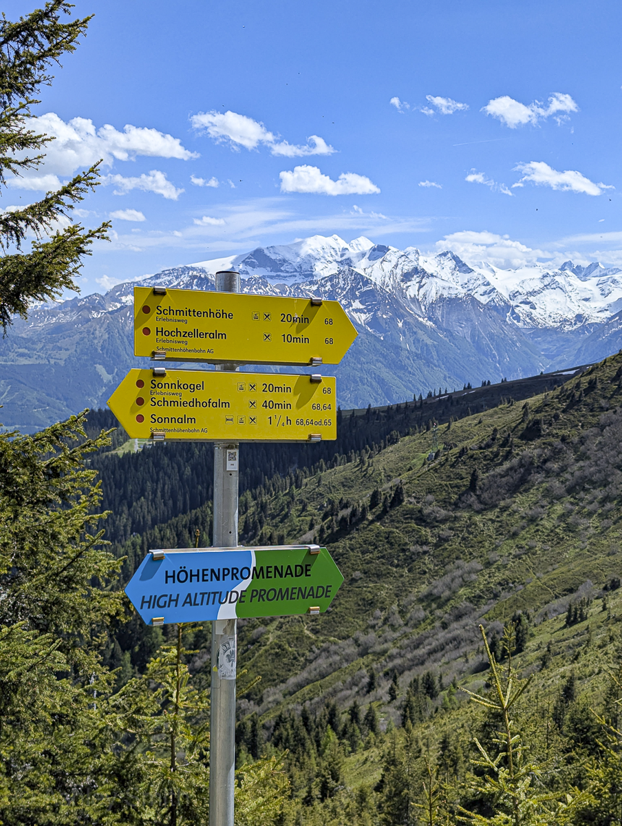 Distance: The Schmittenhöhe day hike as I’m describing it is 2.5km (or about 1.6 miles) total walking. This is the distance from the top of the Schmittenhöhebahn to the top of the Sonnkogelbahn, i.e., just the distance you actually have to hike. This does not include the trips up and down on the cable cars.
