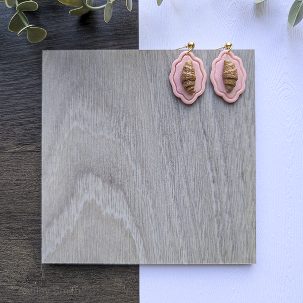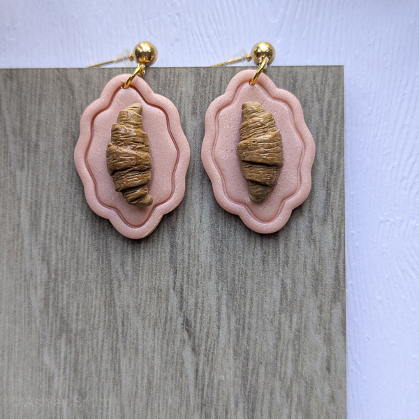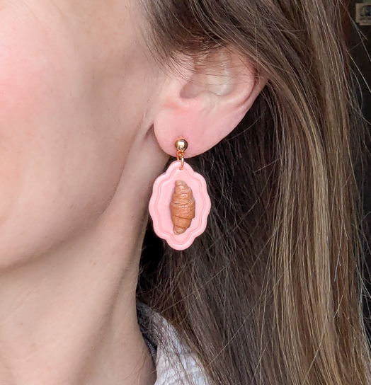 Show off your love of French pastries with these handmade croissant earrings in a peachy/pink frame.