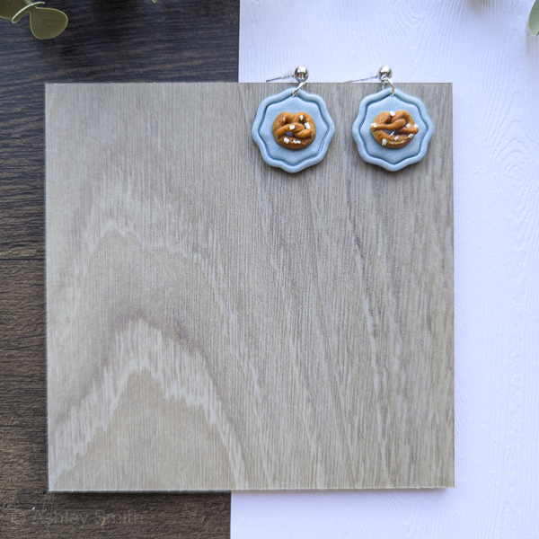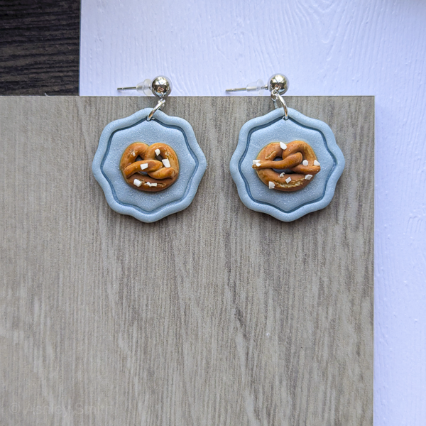 Show off your love of German pastries with these handmade pretzel earrings in a light blue frame.