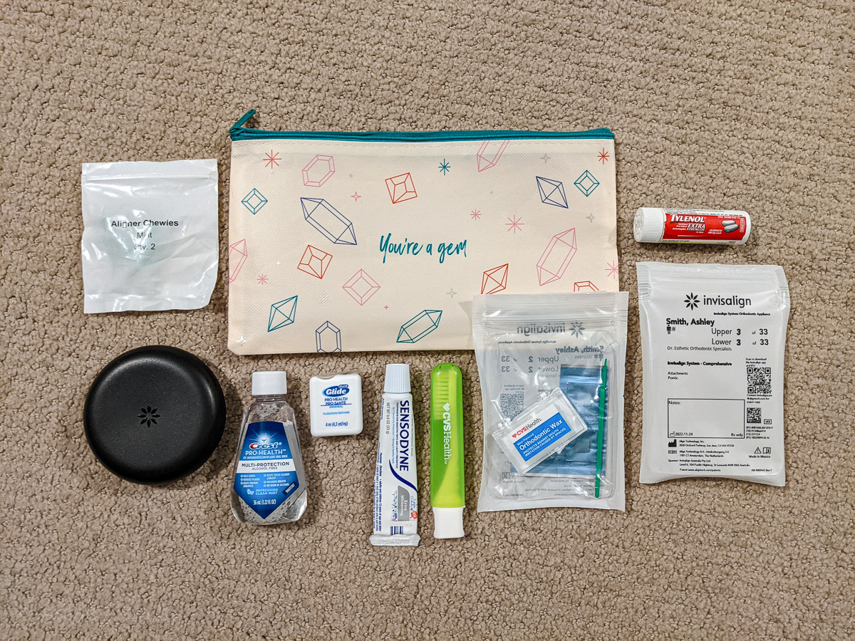 Something I did almost immediately was pack up a small Invisalign travel kit to throw in my purse or carryon. You can use something like a small pencil case, and be sure it includes everything you’ll need like: