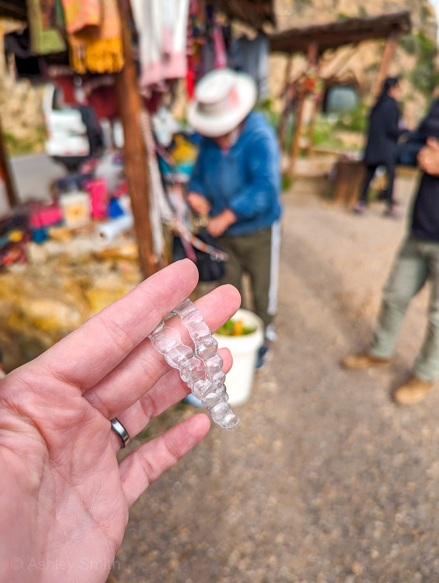 I used to brush my teeth after eating or snacking, regardless of where I was. By the end, I’d just swish with some water and pop them back in. (Because a lot of time when you’re traveling with Invisalign, you literally just can’t brush them. Like while hiking the Inca Trail, or in a remote village in the Sahara Desert.)